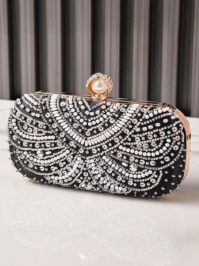 Women’s Black Sequin Evening Clutch with Pearl Accent –
