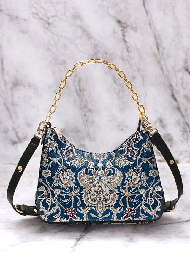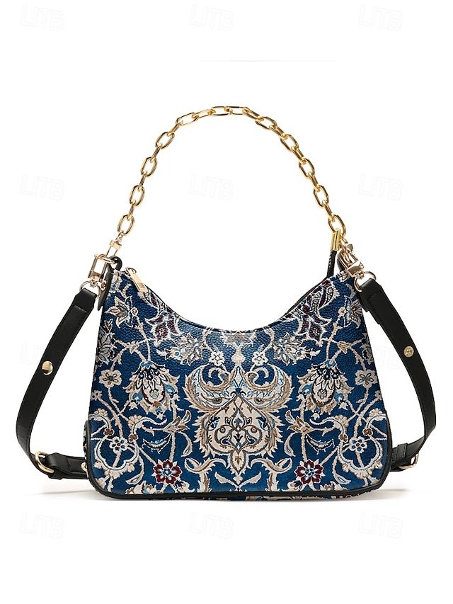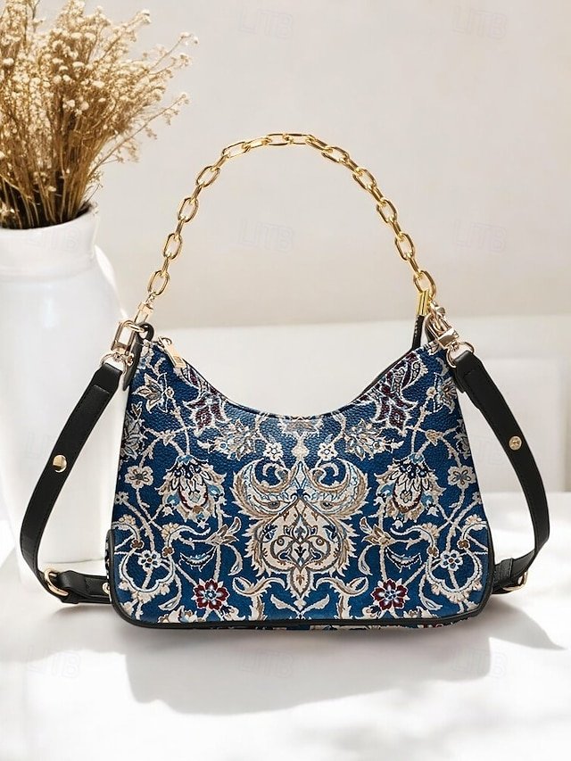 Women’s Vintage Floral Print Shoulder Bag with Gold Chain